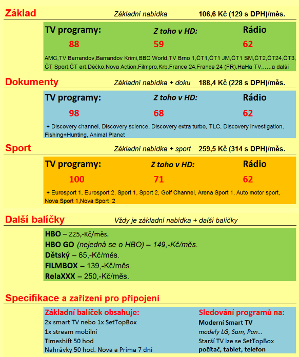 Programy : AMC,TV Barrandov,Barrandov Krimi,BBC World,TV Brno 1,ČT1,ČT1 JM,ČT1 SM,ČT2,ČT24,ČT3,ČT Sport,ČT art,Déčko,Nova Action,Filmpro,Krb,France 24,France 24 (FR),HaHa TV,Hobby TV,Info TV Brno a jižní morava,i-Vysočina,JOJ Family,Kino Barrandov,Krušná TV,Mumlavské vodopády,Galerie zvířat,Ošetřování mláďat,Lounge TV,Love Nature,Markíza International,TV Mňam,TV Mňau,NASA TV,NASA TV UHD,TV Natura,Noční Praha,Nova,Nova Cinema,Óčko,Óčko Expres,Óčko STAR,OIK TV,ORF eins,ORF zwei,Panorama TV,Plzeň TV,Polar,TV Praha,Prima Krimi,Prima Max,CNN Prima News,Paramount Network,Prima COOL,Prima,Prima Love,Prima Zoom,regionalnitelevize.cz,Retro,RT Documentary,Regionální televize jižní Čechy,RT Ústecko,RTM+ (Liberecko),Russia Today,Televize Seznam,Sky News,Šlágr TV,Šlágr Premium,Šlágr 2,TVS,Arena sport 2,Nova 2,Čapí hnízdo,Jednotka,Dvojka,Trojka,TA3,Nova Gold,TV Lux,Life TV,TV Noe,UA TV,Kočičí kavárna,Korálová zahrada,Pláž,V1 TV,ZAK TV V HD kvalitě: AMC,TV Barrandov,Barrandov Krimi,ČT1,ČT1 JM,ČT1 SM,ČT2,ČT24,ČT Sport,ČT art,Déčko,Nova Action,Krb,Hobby TV,JOJ Family,Kino Barrandov,Mumlavské vodopády,Galerie zvířat,Ošetřování mláďat,Lounge TV,Love Nature,Markíza International,TV Mňam,TV Mňau,NASA TV,NASA TV UHD,TV Natura,Noční Praha,Nova,Nova Cinema,Prima Krimi,Prima Max,CNN Prima News,Paramount Network,Prima COOL,Prima,Prima Love,Prima Zoom,RT Documentary,Regionální televize jižní Čechy,RTM+ (Liberecko),Russia Today,Televize Seznam,Šlágr Premium,Šlágr 2,Arena sport 2,Nova 2,Čapí hnízdo,Jednotka,Dvojka,Trojka,TA3,Nova Gold,TV Lux,Life TV,UA TV,Kočičí kavárna,Korálová zahrada, Pláž